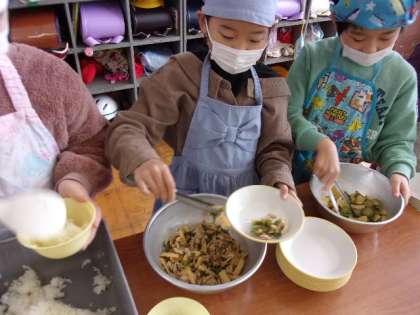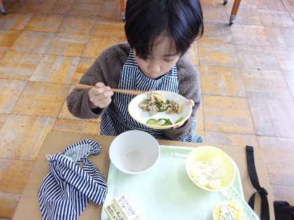 今週は給食週間ということで、給食室を見学しました。今日のメニューは、道徳で学習した「ピーマンマンと夜ふかし大魔王」が由来のおかずでした。大きな鍋でピーマンなどの具材を炒めたり、スープを煮込んだりしているところを見ることができ、給食時も味わって食べることができました。