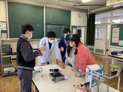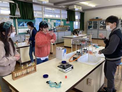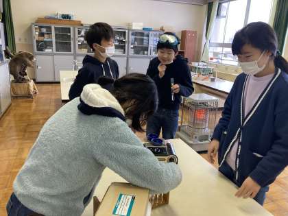1月30日(月) 6年 理科の学習 公開日 2023/01/30 更新日 2023/01/30 6年生 試験管に入った5種類の水溶液について、その正体は何かを調べています。においをかいだり、蒸発させたりしながら、様々な方法で調べる中で、「これはアンモニア水だ!」などど課題を解決することができました。