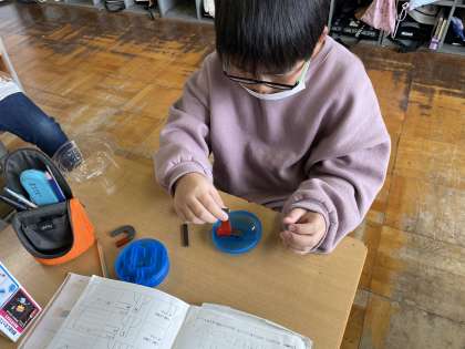子供たちは、磁石の極の性質について、どのように磁石が引きつけ合ったりしりぞけ合ったりするのかを興味深く調べました。