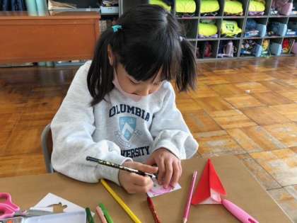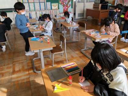 卒業式や入学式のために、廊下や教室にかざるお祝いの飾りを作っています。折り紙で紙飛行機を折り、キャラクターが空を飛んでいるような作品になる予定です。思い思いの絵を描いています。