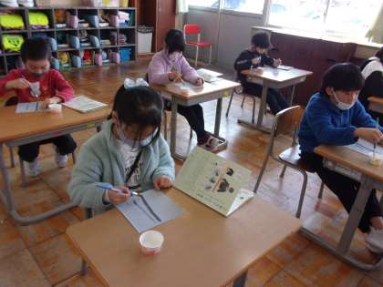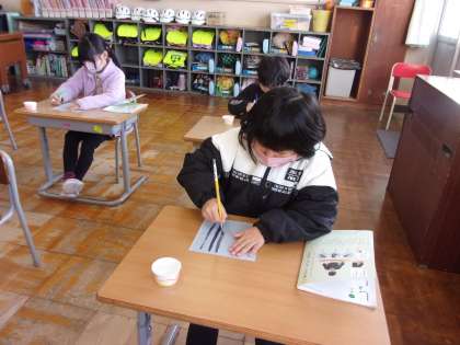筆を使って文字を書く練習をしました。筆を使って書くと鉛筆で書いた文字より、とめ、はね、はらいがはっきりすることに気付きました。美しく書けるように、何度も練習していました。