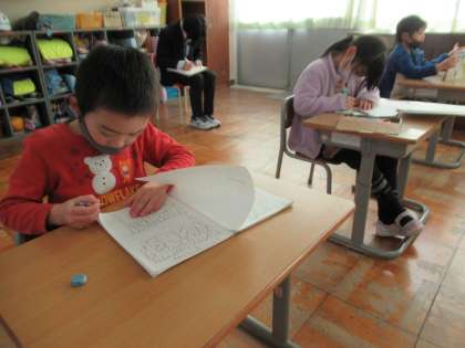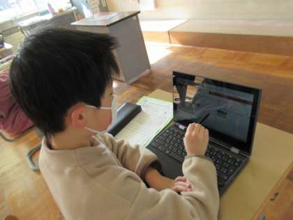 自分自身で考えて学習するパワーアップタイム。一人一人が取り組みたい学習をします。1日の日記を書いたり、習ったばかりの漢字の練習をしたり、算数の問題を解いたり。教室でお世話をしているウーパールーパーの繁殖について調べて、ノートにまとめている人もいました。