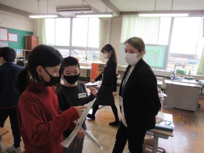 外国語での道案内の仕方を学習しました。友達とペアになり、自分の作った理想の学校を案内しました。
