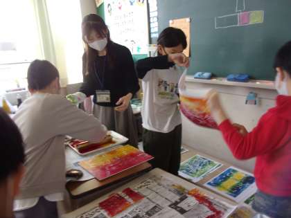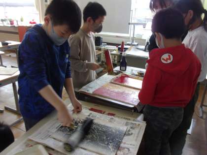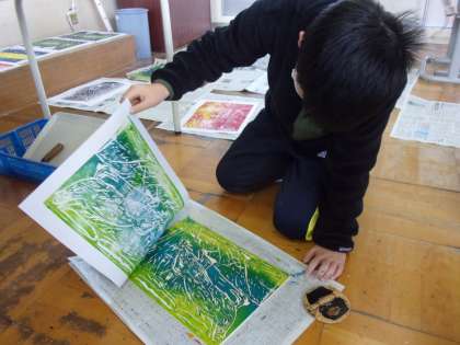 版画の印刷をしました。できあがりを見て、みんな歓声を上げています。