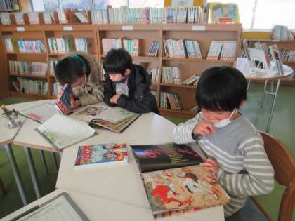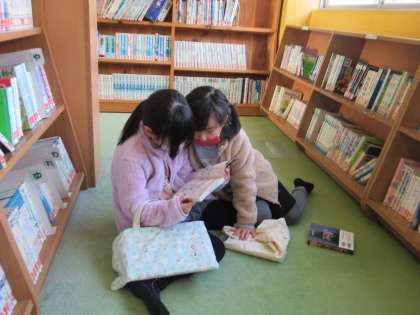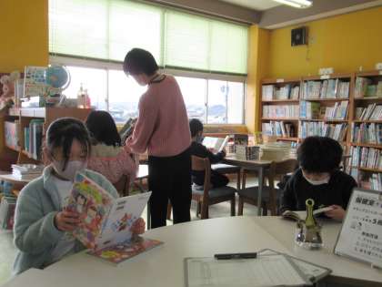 本が大好きな1年生。今日も図書室に本を読みに来ました。司書の先生から紹介してもらったシリーズ本に挑戦している子もたくさんいました。