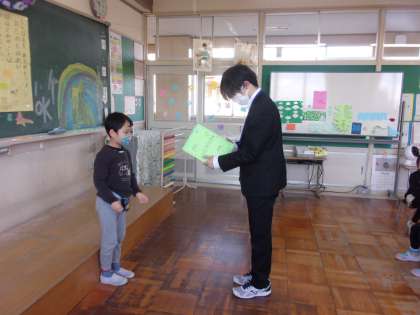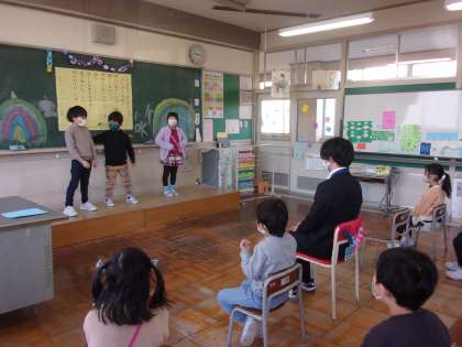 2月16日(木)1年生 お楽しみ会 公開日 2023/02/16 更新日 2023/02/16 1年生 スタディメイトジュニアの先生が来校する最終日でした。お世話になった先生のために、お楽しみ会を開きました。「3時のおやつ」ゲームやプレゼント渡しなど、どの出し物も大盛り上がりで、笑顔いっぱいのお楽しみ会になりました。
