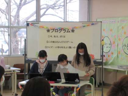 将来の夢や中学校での目標・家族への感謝を、スライドを活用しながら家族に発表しました。その後は、絵を伝言ゲーム形式で伝えたりクイズをしたりして楽しみました。