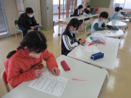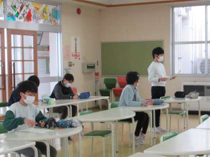 卒業式の呼びかけの練習をしています。どこで言葉を句切ったら良いか、どんな声で、どんな大きさで言ったら良いか。伝えるためにはどうしたらよいのか考えながら、担任の先生からアドバイスをもらい、練習に取り組みました。