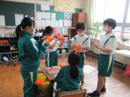 今日も張り切って仕事をしています。メッセージカードチームは、画用紙を切ったり模様を描いたりしていました。飾り付けチームも、慣れた手つきで花を作っています。