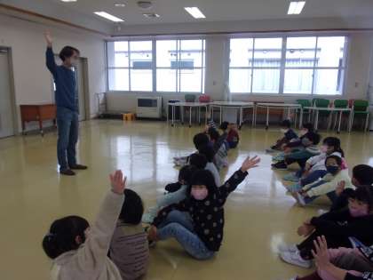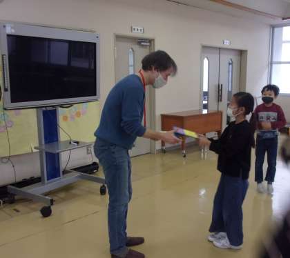 今年度最後の、ジョナサン先生との外国語活動でした。ABCソングや食べ物カルタを楽しみ、どの子供も笑顔がいっぱいになりました。学習の最後には、ジョナサン先生の似顔絵を描いたメッセージカードをプレゼントしました。