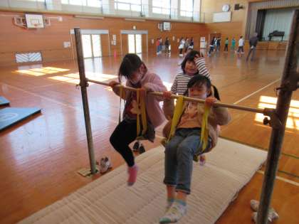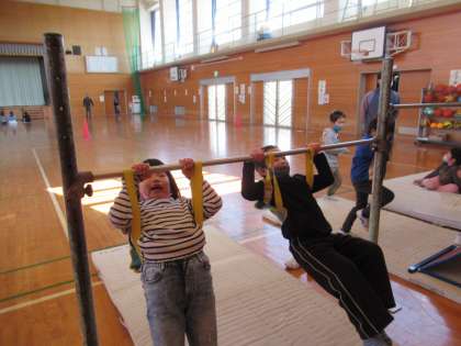 2月27日(月)1年生 のびのびタイム 公開日 2023/02/27 更新日 2023/02/27 1年生 鉄棒に興味津々の1年生。逆上がり練習用のグッズを使って、逆上がりの練習をしたり、ぶら下がって遊んだりしました。