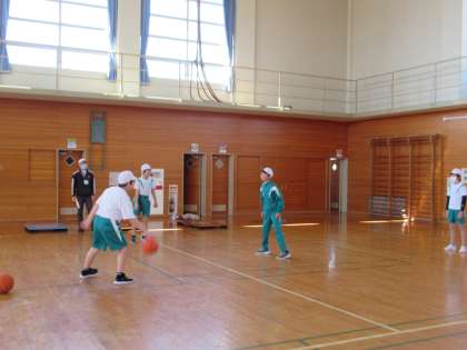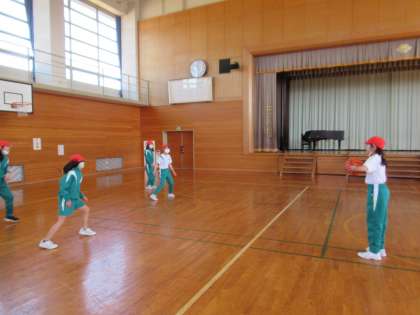 バスケットボールに取り組んでいます。今日は色団ごとに別れて、パスやシュートの練習をしました。