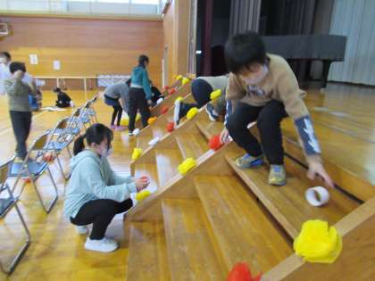 明日全校で行う、6年生へのありがとう集会の会場準備をしています。輪飾りやお花で飾ると、会場がとても華やかになりました。