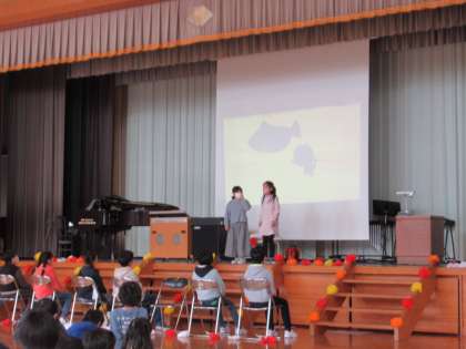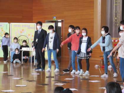 3月3日(金) 卒業を祝う会 3・4・5年生より 公開日 2023/03/03 更新日 2023/03/03 学校行事 3年生からは、6年生さんの思い出をイメージした切り絵を使ったシルエットクイズと、モニューマンの歌を披露しました。 4・5年生は、オセロゲームと紙コップタワーゲームというレクリエーションを行い、4・5・6年生で対決しました。