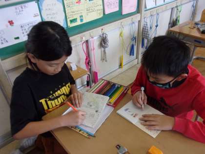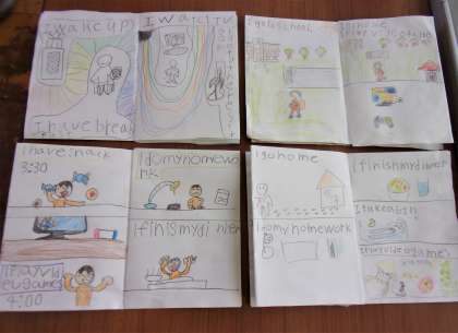 「自分の一日」を、英語で絵本に表しました。朝起きる、歯を磨く、朝食を食べる、学校に行くなど、自分の日課を友達に紹介しながら、楽しんで書きました。できあがった絵本をブリジット先生に見せながら、自信をもってスピーキングをしました。友達の動きを英語で言い当てるジェスチャーゲームも楽しみました。