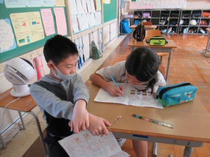 先日、取り組んだ学習のたしかめテストの直しをしています。わからないところは友達に聞いたり、教科書で確かめたりしながら、復習しています。