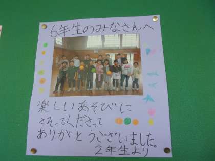 6年生教室に、お礼のメッセージが貼られています。全学年との遊びを考えてくれた6年生へのお礼でした。感謝の気持ちを伝え合う姿が素敵です。