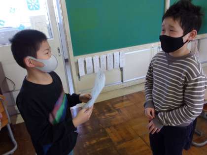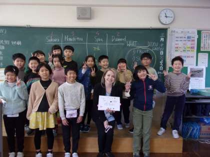 今日はALTのBridget先生との最後の授業でした。子供たちはグループで英語ゲーム対決をしたり、友達に好きな物をたずねたりして一年間に習ったことをおさらいしました。最後にBridget先生に感謝の気持ちを伝えて、お別れしました。