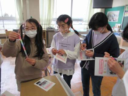 養護教諭から6年生へ、6年間の成長記録をプレゼントしました。6年間で伸びた身長と同じ長さのリボンを、みんなで見せ合いながら、自分たちの成長を喜びました。
