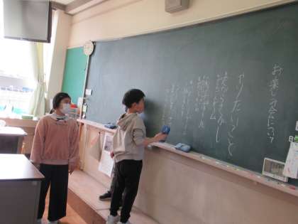 3月20日(月)2年生 学級会 公開日 2023/03/20 更新日 2023/03/20 2年生 クラスで行うお楽しみ会について話し合いました。司会、黒板書記、ノート書記係も、すべて自分たちで行います。頼もしい2年生です。おにごっこがいい、しりとりがしたい、だるまさんがころんだをやりたい!とたくさん意見が出ました。