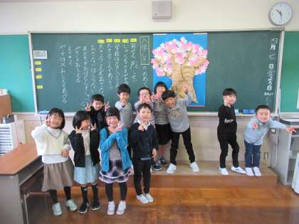 昨日まで61個の花が咲いていた黒板の『朝日桜』に、入学式後、2年生は新たに18個の花を貼り付けました。いよいよ来週から79人の新しい学校生活が始まります。外は雨だったので、『朝日桜』の前で令和5年度スタートの記念写真を「ハイ、ポーズ!」。11人みんなの笑顔が撮れるまで・・・8回もシャッターを切りました。