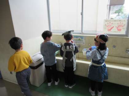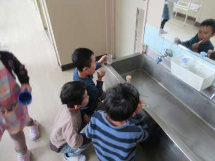 各階の洗面所に砂時計を設置しました。3分間しっかり歯みがきをするために使います。給食を食べ終わったあと、子ども達は砂時計を見つめながらていねいに歯みがきをしました。