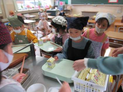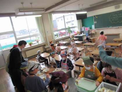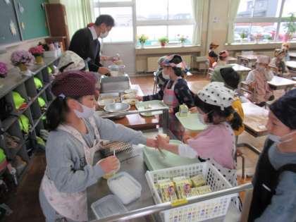 4月12日(水)1年生 はじめての給食当番 公開日 2023/04/12 更新日 2023/04/12 1年生 今日から、給食の準備と片付けを自分たちで行いました。手を洗って、三角巾、マスク、エプロンを着用して、準備はばっちりです。 先生に教えてもらいながら、上手に配膳できました。