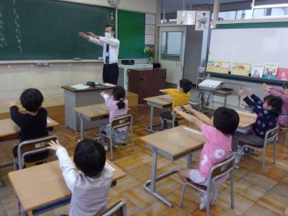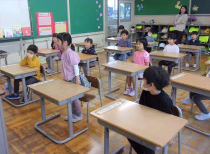 国語の最初の授業は、音読です。教科書を見ながら、ゆっくりはっきり読もうとしています。書写では、文字を書く前の書写体操を教わり、気持ちの準備をしました。そして、「私の名前は6文字です。」などと、自分と友達の名前の画数を数え合いました。