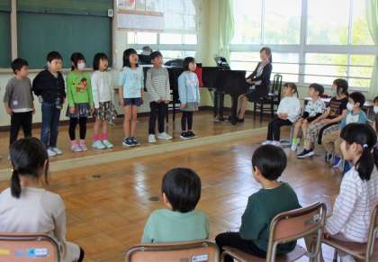 2年生と一緒に歌ってにこにこ、2年生の歌声を聞いてわくわく。楽しい音楽になりました。