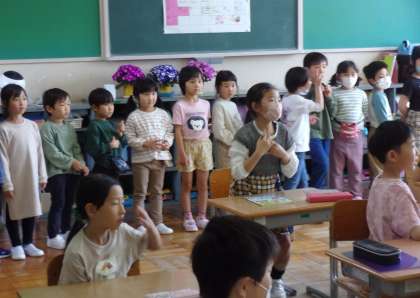 3年生の外国語の授業では、3年生が日本と外国のクイズに答えている様子に見入り、「おもしろかったね」と言い合いました。