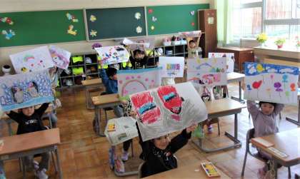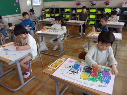 初めての図工の時間は、好きな物や好きなことを話しながら、自由に描きました。ロボットやゴジラ、サッカーや野球、ピアノや風船等、大きく伸び伸びと描き、クレヨンでカラフルに塗り込みました。個性あふれる楽しい作品が集まりました。