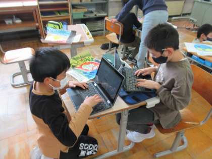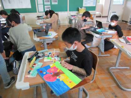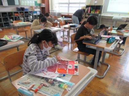 4月17日(月)5年生 図工の学習 公開日 2023/04/17 更新日 2023/04/17 5年生 友達の作品を見て、「ここ好きだなあ」「ここいいなあ」と思うところを、クロムブックに書き込みました。それぞれに作品を見合って、「この色づかいがいい」「この色がこういうことを表現している」と、感想を伝えあいました。