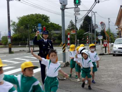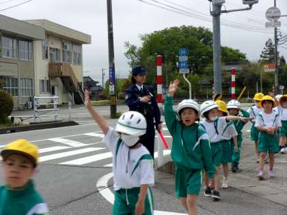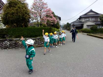 4月19日(水)交通安全教室その2 公開日 2023/04/19 更新日 2023/04/19 学校行事 1年生は、校区内を安全に気を付けて歩きました。左右を確認したり、手を挙げて道を渡ったりするなど、交通ルールを確認しました。