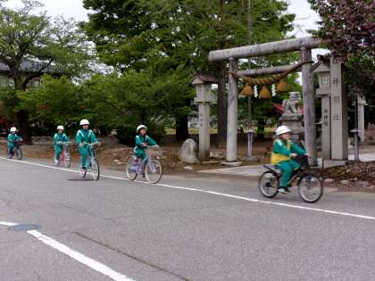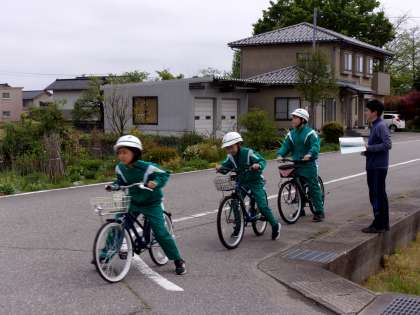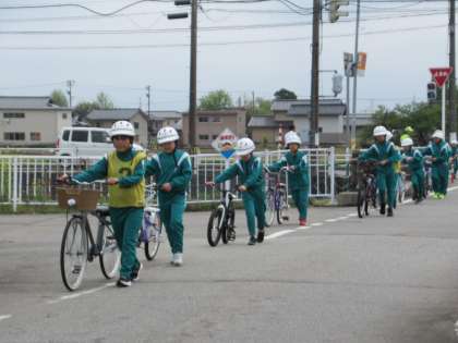 4月19日(水)交通安全教室その4 公開日 2023/04/19 更新日 2023/04/19 学校行事 3〜6年生は、実際に道路に出て、自転車の交通ルールを確認しました。警察の方やPTAの方、先生たちに見守られながら、安全に気を付けて自転車教室を行いました。 お昼の振り返りの時間に、 「放課後、友達とよく遊びに行くから、自転車のルールを確認できてよかった」 「もう少し大きくなったら、家の人と遠くまで自転車に乗りたいから、交通ルールをちゃんと覚えておきたい」 と話しました。
