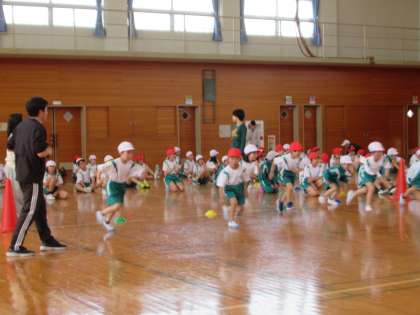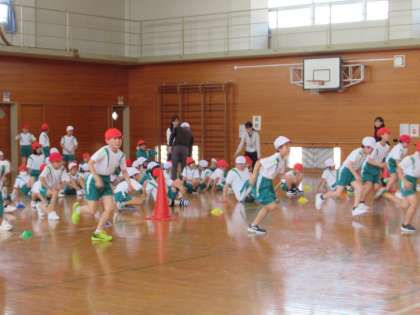 今年度初めての体育タイムです。今日は、1〜6年生みんなで走る運動に取り組みました。