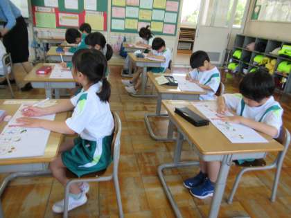 今日もひらがなの練習です。先生の声に合わせて、指書きをします。ていねいに書いています。