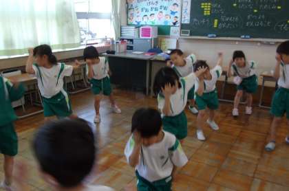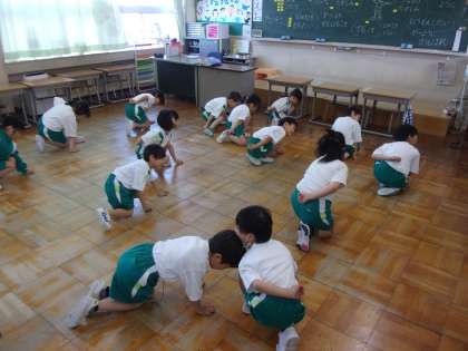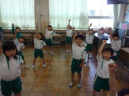 運動会のダンスに、のりのりの1年生です。前奏からカウントを取り、歌も歌いながら笑顔で踊りました。繰り返すうちに、動きがどんどんきれよくなってきました。