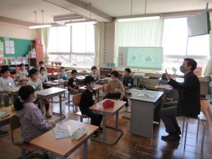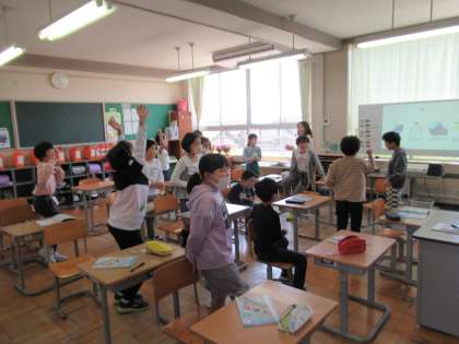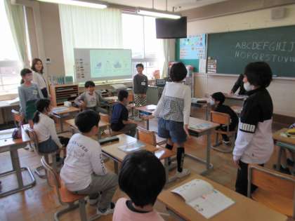 5月9日(火)4年生 外国語の学習 公開日 2023/05/09 更新日 2023/05/09 4年生 アルファベットを順番に言うゲームをしました。一人一つアルファベットを言っていくのですが、「A!」「B!」「「C!」」と、同じアルファベットを二人以上で言ったら失敗です。タイミングを合わせるために、みんなの様子をよく見るのがポイントです。 「また重なった!」 「みんなで目を見合わせてやってみようよ」 「やっと成功した!」 と、声を掛け合いながら楽しくアルファベットを学習しました。