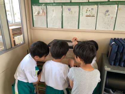 休み時間になると水槽の周りに集まって、ホクリクサンショウウオをまじまじと観察していました。みんなで大切に育てていきましょう。
