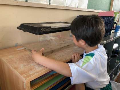 先日から里親になったホクリクサンショウウオに興味津々な1・2年生です。
