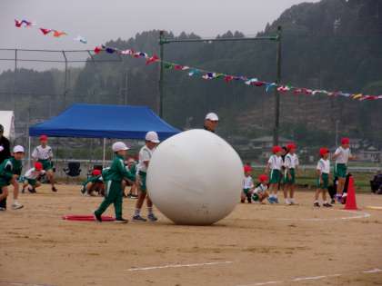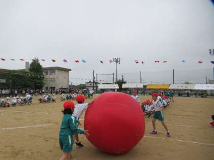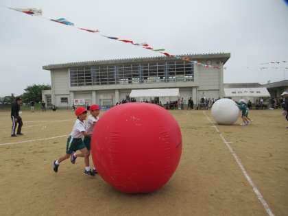 5月20日(土)運動会 大玉すいか転がし 公開日 2023/05/20 更新日 2023/05/20 学校行事 団体競技「大玉すいか転がし」では、朝日のすいかに見立てた大玉を、なかよし班のペアで協力しながら転がしました。仲間と息を合わせながら、一生懸命にゴールを目指しました。