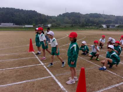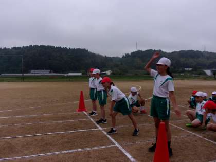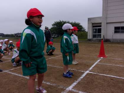 初めの競技は、50m走です。準備運動、ウェイクアップダンスで体をほぐし、応援合戦で気持ちを高め、緊張のスタートです。赤白どちらの団も力一杯最後まで、走りきりました。