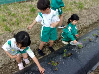 「ちょっと元気がないよ」「喉かわいてるよ」とたっぷり水をやる子供。「枯れてる葉っぱがある」と葉を取る子供。全ての苗を全部見て回る子供。