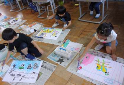 「動物が分かりやすくなるように、周りは薄い色にしよう」「動物が暗くならないように、空は明るい水色にしよう」「ぼくは色を混ぜたいな。どうやって混ぜようかな」などと,考えながら自分の思う表現になるように工夫して取り組みました。ますます、個性あふれるすてきな絵に仕上がりました。