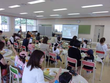 配膳の様子を見ていただき、その後は給食を味わっていただきました。そして、栄養士からは、献立や食育についてお伝えしました。