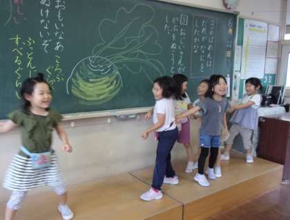 「おおきなおおきなかぶができました」という文章から、「うんとこしょ、どっこいしょ」とかぶを重そうに引っ張ったり、「こっちがすっとんでしまうよ」と転んでみたりしました。