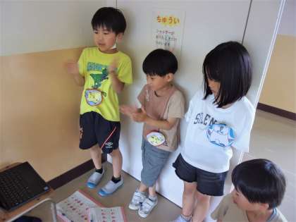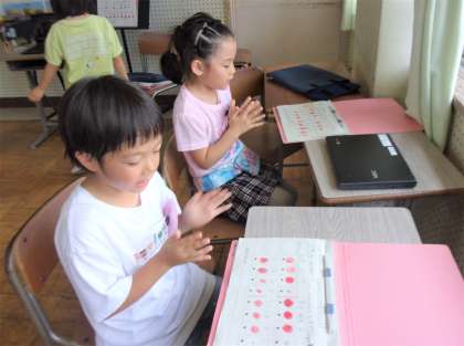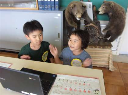 「はくにのってリズムをうとう」の学習で、ペアになり、好きな場所で自分たちの動物リズムをつくっています。「えもの ねらってる ととととと ころんでる」とおおかみさん。「ぺろぺろ なめてるよ ぐう ぐう バナナのゆめ」とハリネズミさん。拍にのって、それぞれの言葉をリズムをのせ、友達と「つながってきたね」と音楽になる感じを味わっています。楽しい「ズーズーリズム」になりそうです。