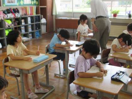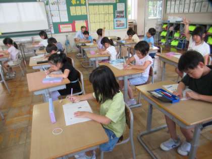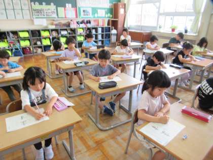 今日は「む」や「ま」など、むすびの部分があるひらがなの練習です。背筋を伸ばして、足を床につけて、ていねいに字を書いています。