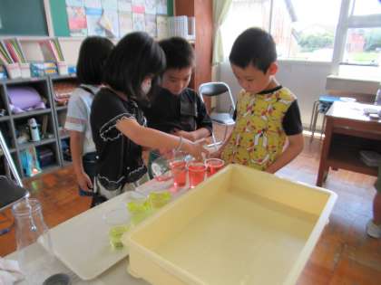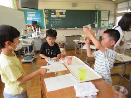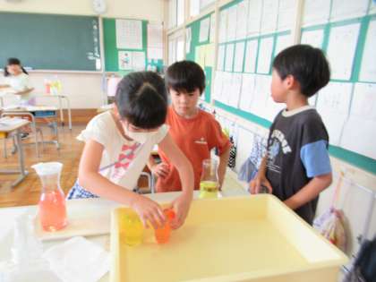 6月27日(火)2年生 算数の学習 公開日 2023/06/27 更新日 2023/06/27 2年生 どちらの水筒の方がたくさん水が入るか、実際にコップを使って水の量を量りました。 「どっちが多いかな」 「コップの大きさを同じにしたらいいよ」 「あれ、他の班とコップの大きさちがうんじゃない?」 正しく量るために、慎重に、考えました。