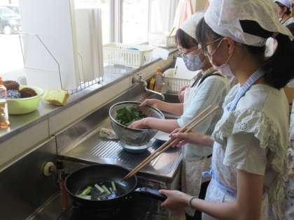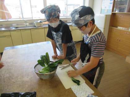 家庭科の学習で、青菜の油炒めをつくりました。しゃきっとした食感になるように、強火で短時間炒めることをポイントにしました。友達と仕事を分担することで、手際よく調理することができました。